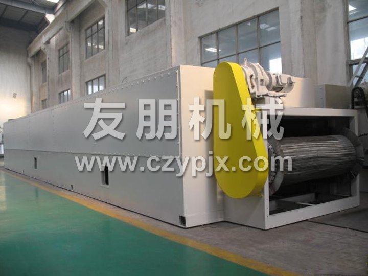 整個生產(chǎn)線為全封閉型(對物料而言),由擺動布料段、干燥段、出料段三部分組成。擺動布料段作用使海藻均勻分散在網(wǎng)板上,并且勻速輸送到干燥段,海藻經(jīng)過80℃熱風(fēng)干燥段,90℃熱風(fēng)干燥段和120℃熱風(fēng)干燥段后,再經(jīng)過出料段排料。循環(huán)風(fēng)向及各單元內(nèi)風(fēng)的循環(huán)為向下式,即加熱后的空氣由引風(fēng)機(jī)吸入,在風(fēng)機(jī)出風(fēng)口首先預(yù)分布再經(jīng)過孔板均風(fēng)后,熱風(fēng)從物料的下面向上(或從物料的上面向下)穿透物料層。